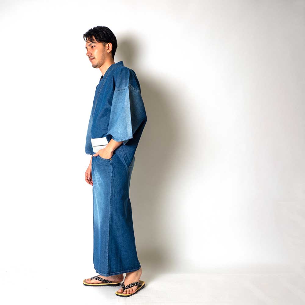 |送料無料|【着物+帯+下駄+腰紐】デニム着物浴衣メンズ・インディゴ・ダメージ加工 男性用お仕立て上がり着物浴衣4点セット|メンズ|男ゆかた|着物|ブルー|青|無地|